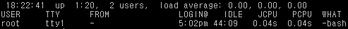 root 는 콘솔로 접속해서 IP 가 없음. 05:02pm 에 접속해서 44:09 동안 아무것도 안했다.